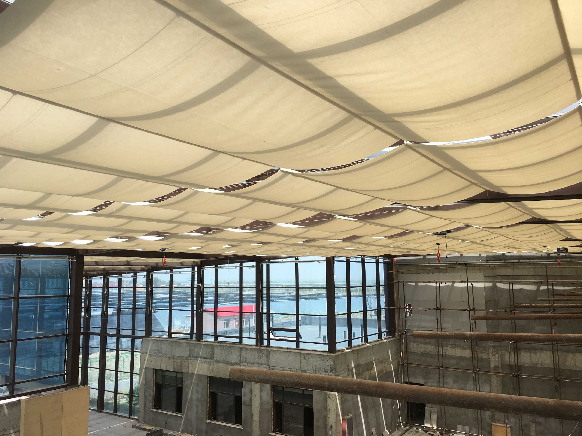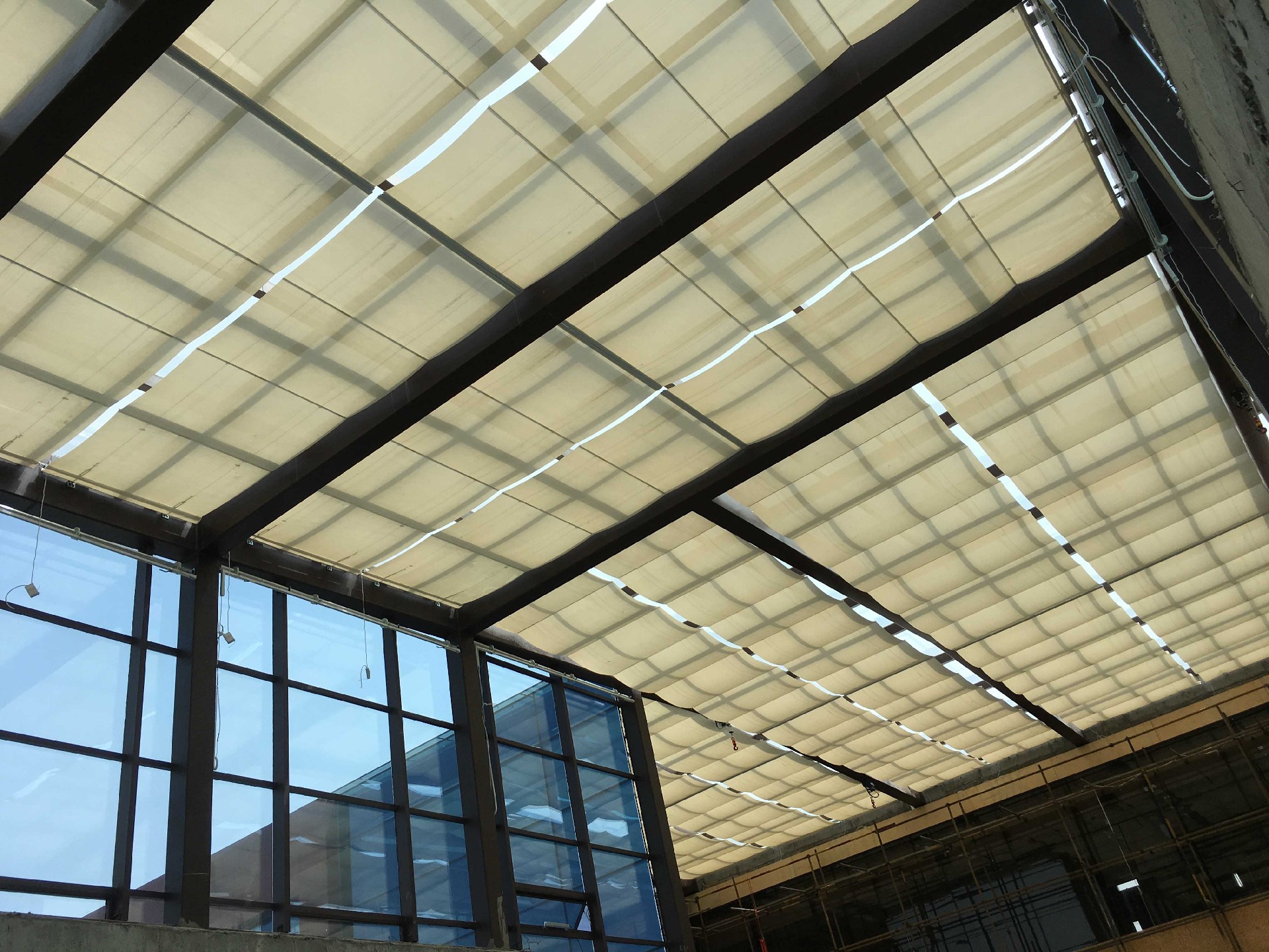 可以是直線,也可以是弧形,運(yùn)用得當(dāng)可以基本和建筑曲線相吻合,既遮陽又保持建筑設(shè)計的風(fēng)格。該機(jī)構(gòu)選用系列同步電機(jī),面料中有支撐桿,收攏時呈折疊狀,故面料無須承受很大的抗拉強(qiáng)度,對面料的張力要求不高,而且便于安裝。特點(diǎn)是結(jié)構(gòu)簡單,運(yùn)行平穩(wěn),成本低,特別選用于平面,斜面和弧形的框式玻璃結(jié)構(gòu)頂。適用于工程和民用,現(xiàn)已廣泛運(yùn)用于別墅玻璃頂和陽光房的遮陽。