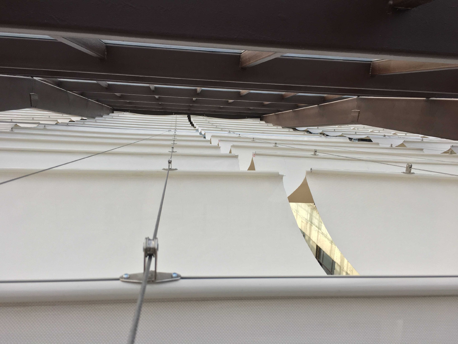 系統(tǒng)利用管狀電機(jī)旋轉(zhuǎn)帶動鋁合金卷管轉(zhuǎn)動,由于卷繩器直接固定在鋁合金卷管上卷繩器被動轉(zhuǎn)動并卷繞已經(jīng)纏繞在卷繩器上的卷拉鋼絲,卷拉鋼絲的兩端都固定在同一卷繩器上,另一端通過一個定滑輪導(dǎo)向(定滑輪底部有伸縮彈簧,起到繃緊鋼絲的作用),形成循環(huán)形式,運(yùn)行時鋼絲在卷繩器上做循環(huán)運(yùn)動,一頭鋼絲放出,一頭鋼絲收緊。面料上方固定導(dǎo)向 鋼絲,寬度2米內(nèi),通常使用2根導(dǎo)向鋼絲,寬度超出2米寬度則需使用3根導(dǎo)向鋼絲,導(dǎo)向鋼絲始終處于緊繃狀態(tài),遮陽面料通過面料支撐桿懸掛在導(dǎo)向鋼絲上,卷拉鋼絲與最前端的面料支撐桿固定連接,從而帶動整套遮陽系統(tǒng)運(yùn)行。該系統(tǒng)可使用開關(guān)、遙控或智能控制方式。